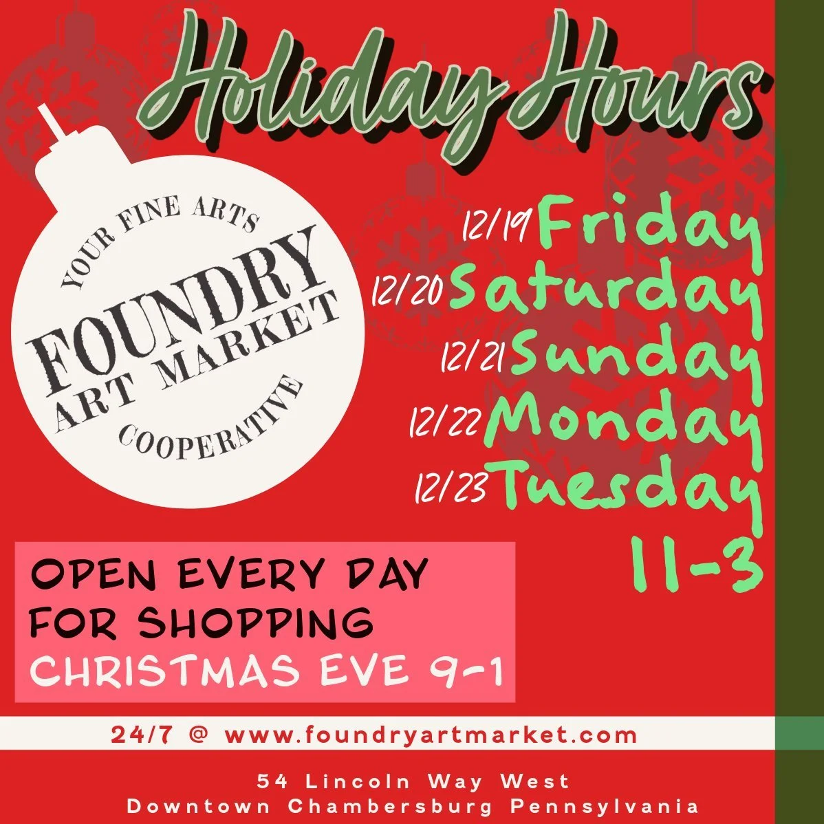 The FOUNDRY’s corner store in downtown Chambersburg houses a retail shop where guests can purchase unique, one-of-a-kind pieces that are made locally, view rotating exhibits featuring the work of artists both local & national..